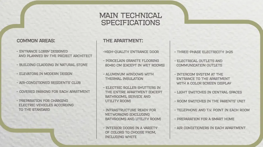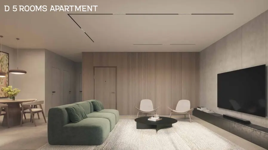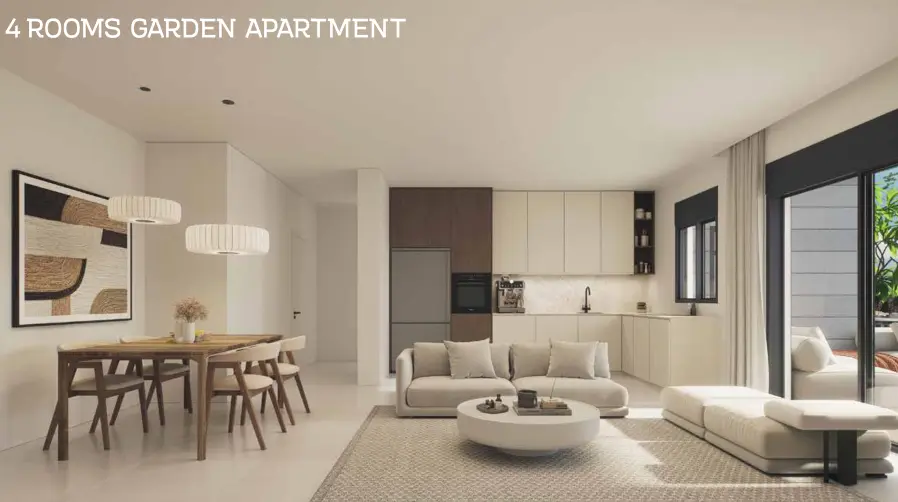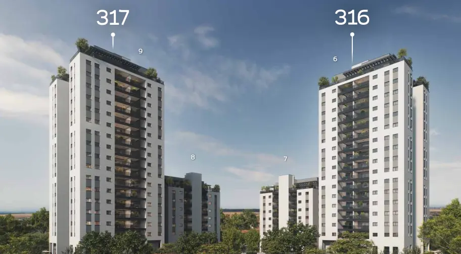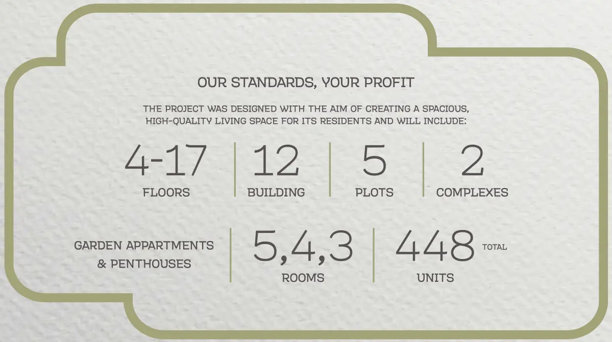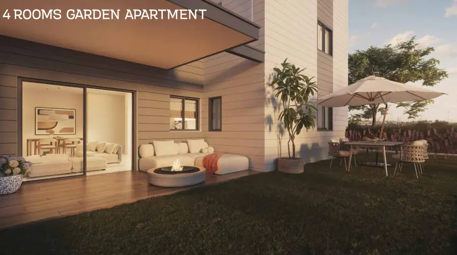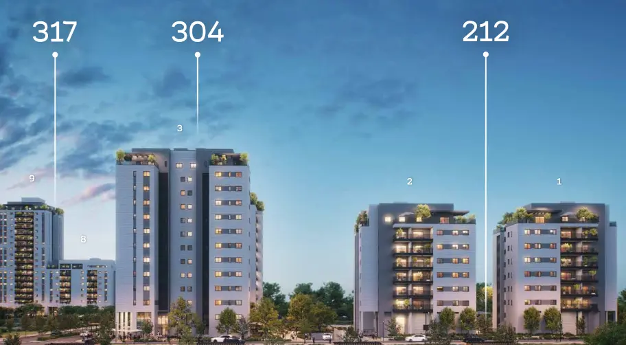 - Apartment types: 3, 4, and 5 rooms, garden apartments, and penthouses.